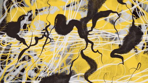 Youri's paintings are intense, unfiltered, and visceral. They often depict characters with distorted features or abstract landscapes that unfold like the forests of our childhood nightmares.